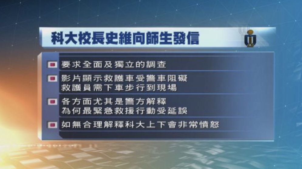 他之后向科技大学全体职员和学生发信,要求香港政府就周梓乐去世做一个“彻底和独立”的调查,他在信中特别指出,事发时有片段显示一辆正赶往现场的救护车被停泊的警车阻挡去路,救护员需要下车徒步前往现场,延误救援工作。