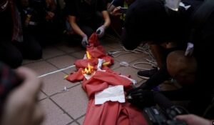 香港抗议者在屯门的示威活动中焚烧中国国旗。(2019年9月21日)
