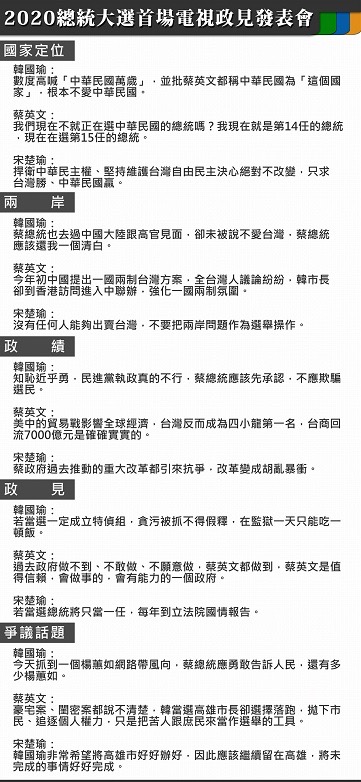 (中華新聞通訊社訊)2020總統大選首場電視政見會今天登場,三位候選人總統蔡英文、高雄市長韓國瑜、親民黨主席宋楚瑜首度同場交鋒,雖然是沒有交叉詰問的政見會,但三人砲火猛烈,儼然是另類辯論會。