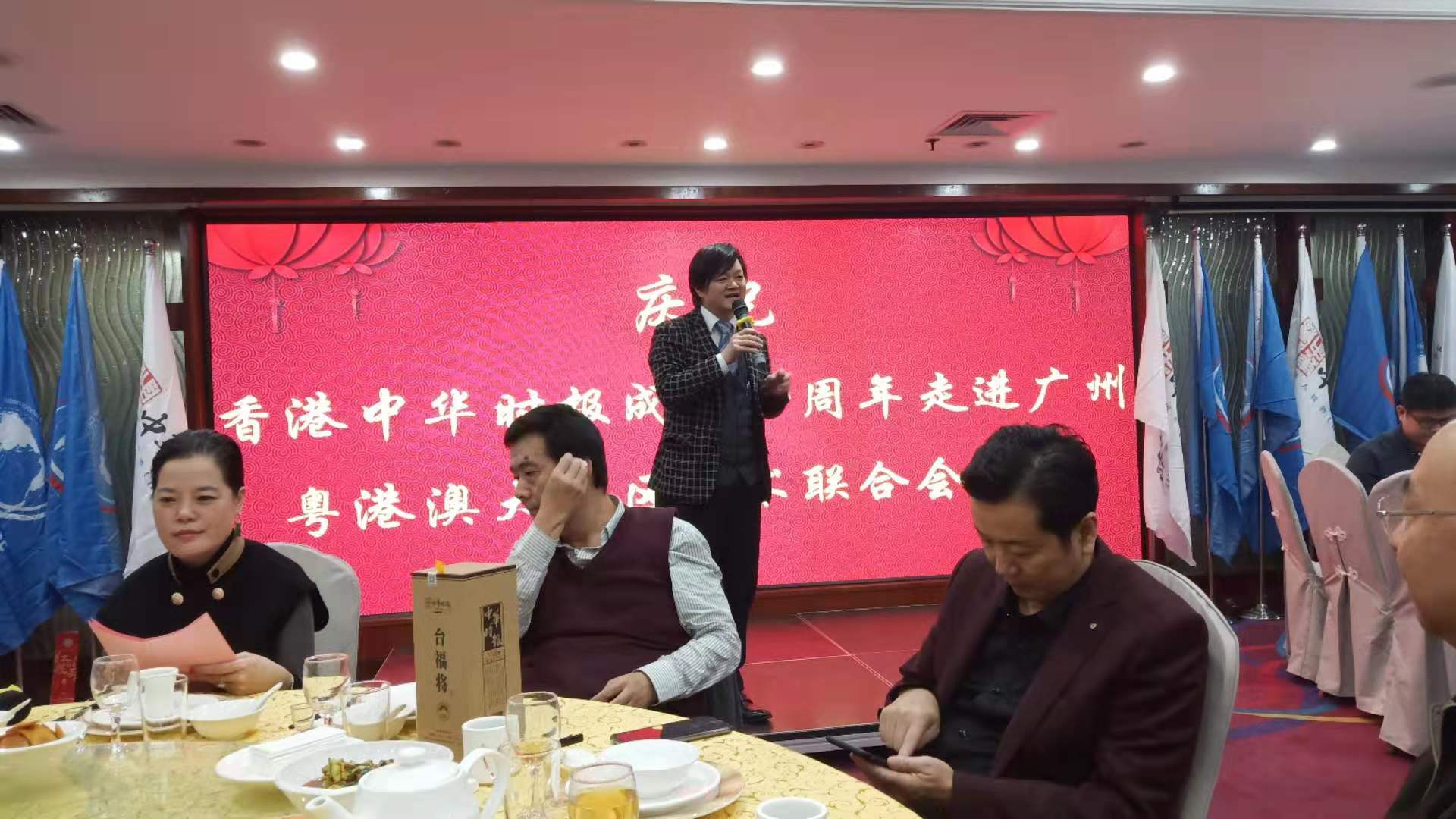 晚宴上,中华时报传媒集团主席曾晓辉博士代表主办单位致辞,他表示中华时报于2009年12月在香港成立,第一报纸8版,印数5万份,但香港只买了5千份,一路走来很艰辛,但得到了广大读者和朋友们的支持,今在世界各地相继成立25个总分社,今拥有456位专业记者,遍布全球各地,为新闻传播事业贡献良多,今年中华时报的十周年,前后在英国、香港、广东阳春、台湾高雄、澳门等地举办了庆祝活动,今晚在广州举办,主要是答谢广州广大朋友和同事,今天也略备薄酒与大家共饮相叙,共同迎接新年到来,祝大家新年步步高升!