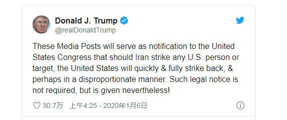 美国总统特朗普多次威胁称,如果伊朗对苏莱曼尼之死进行报复,美国必将反击。特朗普还称,届时美国可能采取“一种不成比例的方式”。