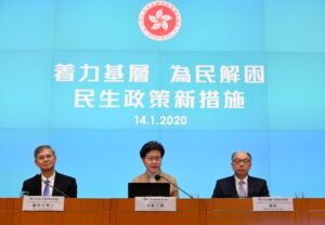 ![]() 行政长官林郑月娥(中)今日(一月十四日)下午就民生政策措施举行记者会。劳工及福利局局长罗致光博士(左)和运输及房屋局局长陈帆(右)亦有出席。