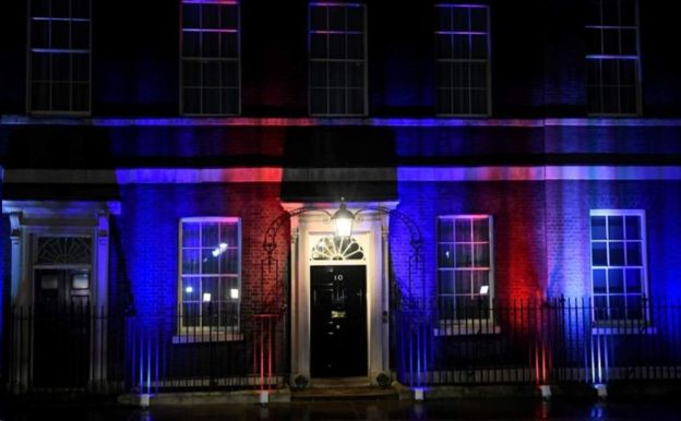 首相府外,灯光时钟倒计时显示走向脱欧的分分秒秒,象征英国国旗的红白蓝三色彩灯照亮政府重要部门聚集的“白厅”。