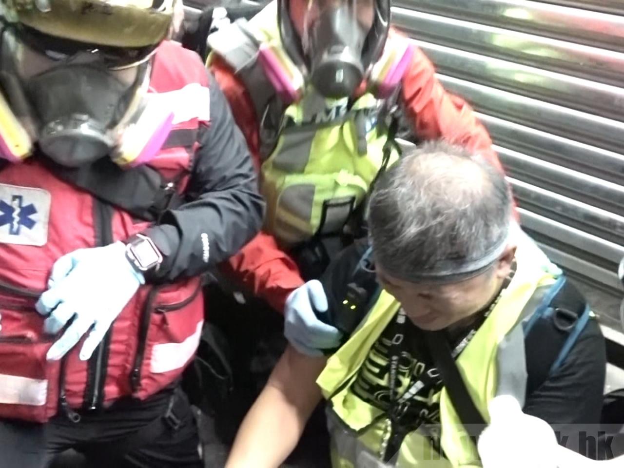 香港元朗7.21袭击事件8个月,有市民响应网上号召到元朗,警方晚上近10时,多次在又新街一带施放胡椒喷剂,有记者及市民被喷中,义务急救员为他们冲洗眼睛。