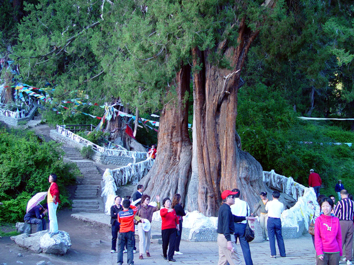 傍晚时分,记者一行从林芝八一镇穿过,来到距此东南方向十多公里的著名世界古柏园林参观。林芝县古柏园林在当地藏族群众心目中是圣地,传说苯教开山祖师辛饶米保的生命树即是古柏,所以林中那些最大最古老的树身上总是缠挂着风马,树林中还到处是玛尼堆,常有信徒远道前来朝拜。