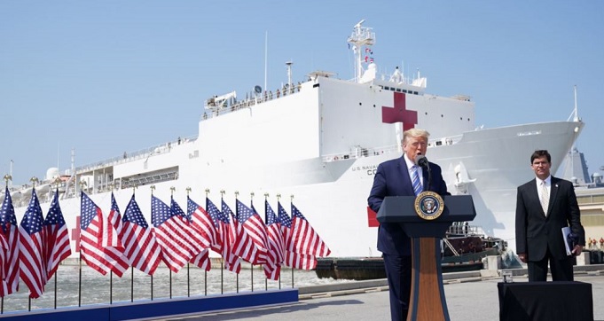 特朗普随后启程前往佛吉尼亚州诺福克军港为一艘前往纽约市的海军医疗船送行。他在推文中说,“我正在考虑对纽约、新泽西和康涅狄格州这三个‘热点’地区实施隔离检疫。无论隔离还是不隔离,将很快做出决定”。