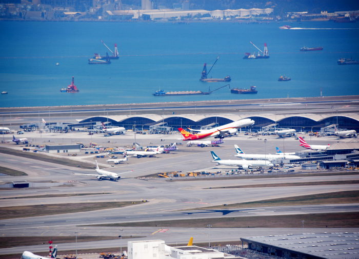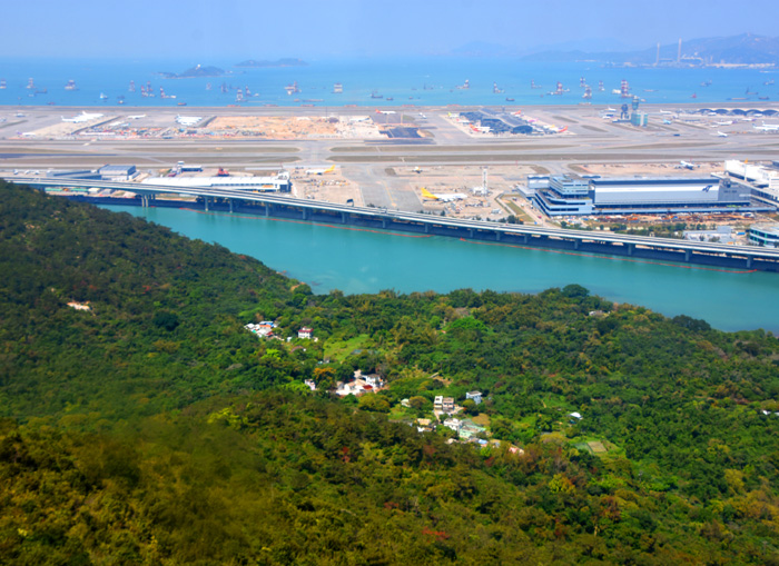 乘缆车前往大屿山途中观赏海天风光的景象十分壮美,香港国际机场与粤港澳跨海大桥等景观历历在目。特别是从缆车上俯瞰大海中壮观的粤港澳大桥,好像从陆地上架起伸进大海中的一条飞龙,而延伸的跨海大桥的龙头好似钻进了大海。