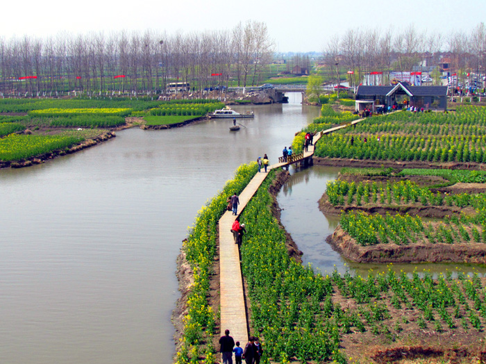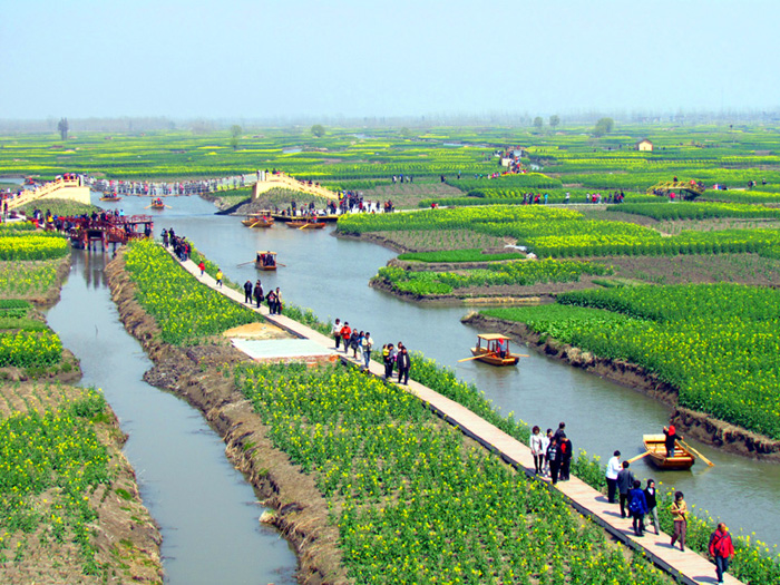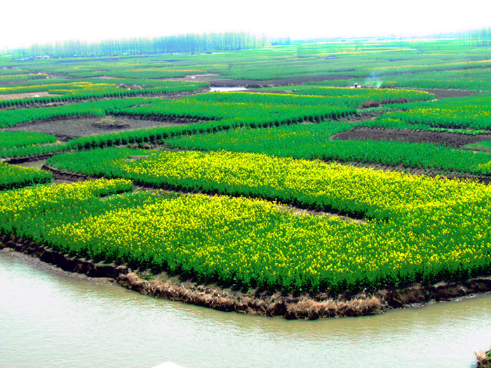 千岛菜花自然景观的千垛与沟河交错其中,垛格环水,景色怡人。远看油菜地,平畴无际;近观其详,每条垛田都浮漾于水中,活像是那硕大的水面盆景,曲折蜿行于垛地的沟恤纵横间。