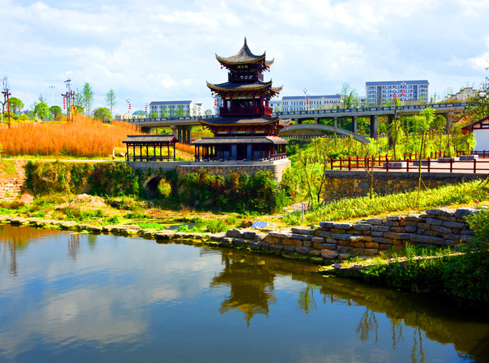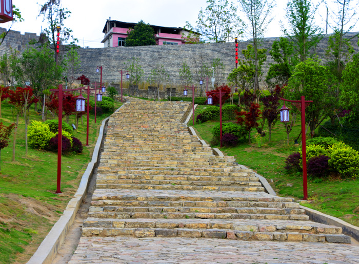 从城墙的垛口向外看,潮音阁掩映在绿树从中,溪水潺潺,碧波一潭,植被茂盛,五颜六色的花草,拥有古老历史传说的平越驿站景观,福泉古城墙文物保护纪念碑,古墙牌坊等古城小景交相辉映,古与今的交融,无不诠释体现着福泉古城其深厚的文化底蕴。