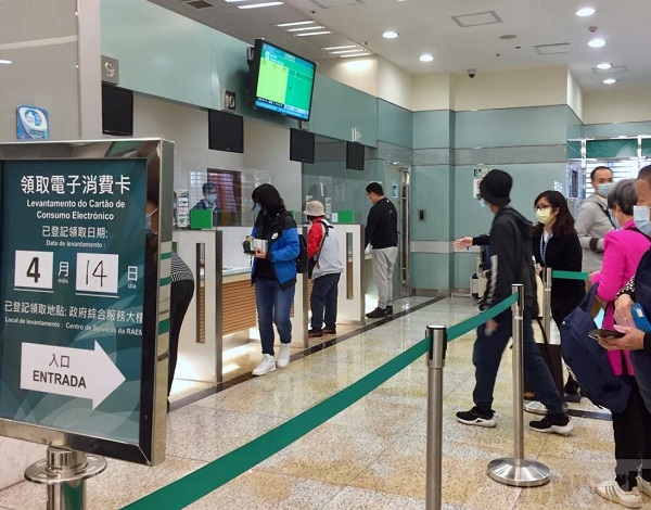 今日是可領取首輪電子消費咭的第一日,各領取點都有人一早排隊,在首1小時有逾9成已登記人士按時領咭,並用身份證即時激活。他們可在5月1日至7月底前使用。澳門已經約有65萬人在網上自選由今日至月底前的任何一日,到149個政府部門和銀行的任何一個服務點,在指定時段帶同身份證領取首輪3000元電子消費咭。