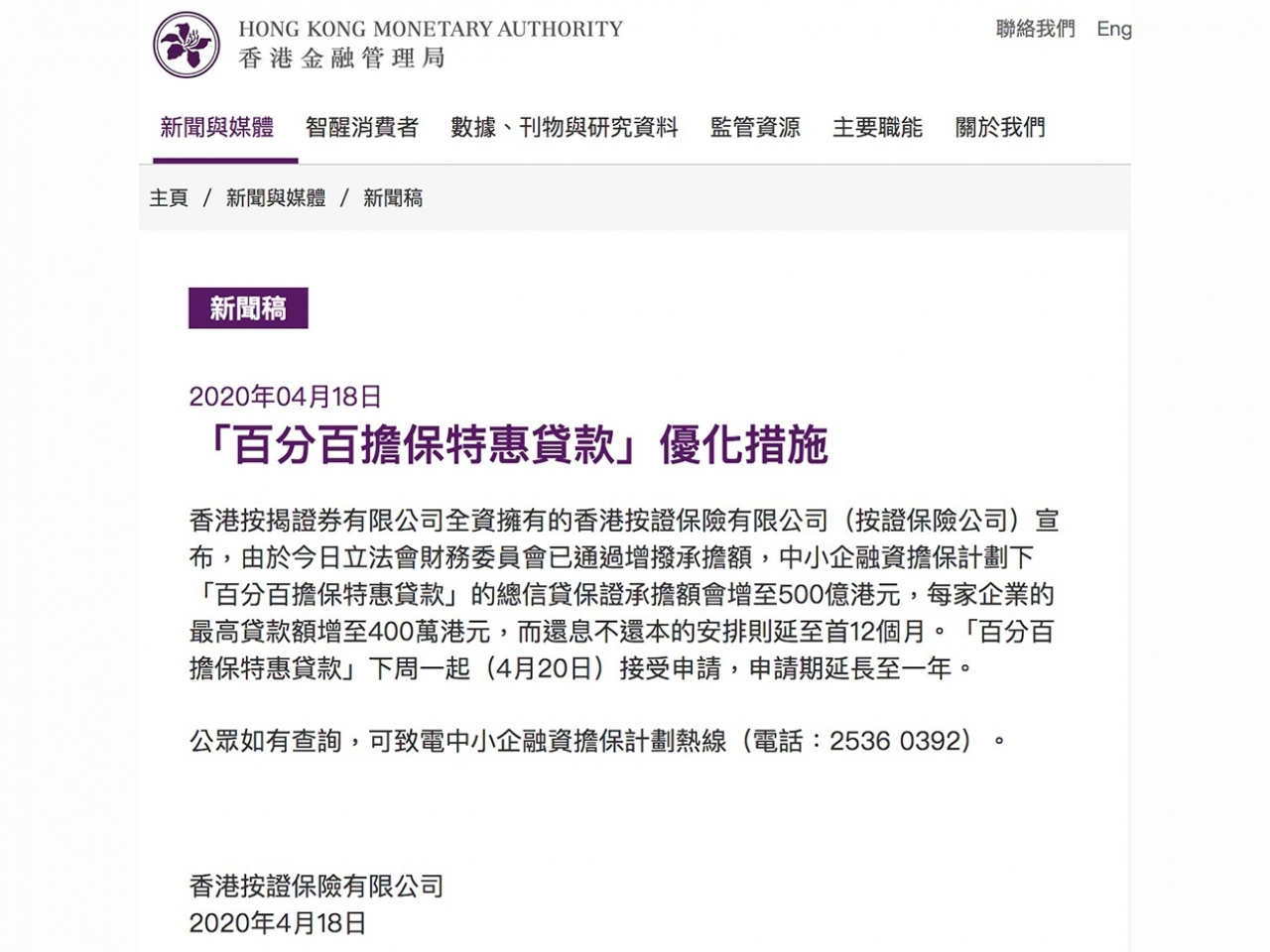 按證保險有限公司宣布,由於財委會已通過增撥承擔額,中小企融資擔保計劃下「百分百擔保特惠貸款」的總信貸保證承擔額會增至500億港元,每間企業的最高貸款額增至400萬元,還息不還本的安排則延至首12個月。