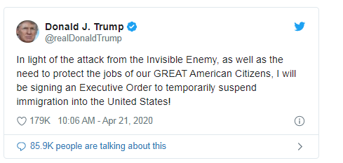 专题国际新冠肺炎 特朗普总统透过推特表示将暂停移民进入美国 由 中華時報總編室 - 编发 2020年4月21日 (中华时报讯)美国总统特朗普透过推特表示:“考虑来自隐形敌人的攻击,以及保护伟大美国公民的工作需求,我将签署一项行政命令,暂停移民进入美国。” 美国近期经济数据逐渐显现新冠疫情所造成的冲击,美国许多商店被迫关门,加上失业率攀升影响消费能力,美国3月零售销售额创下1992年以来的新低。 新冠疫情已经蔓延至全球212个国家,累计确诊病例突破240万,死亡人数超过16.8万。 美国是这次疫情的最大震央国,确诊病例已经突破76.6万例,死亡人数超过4万。