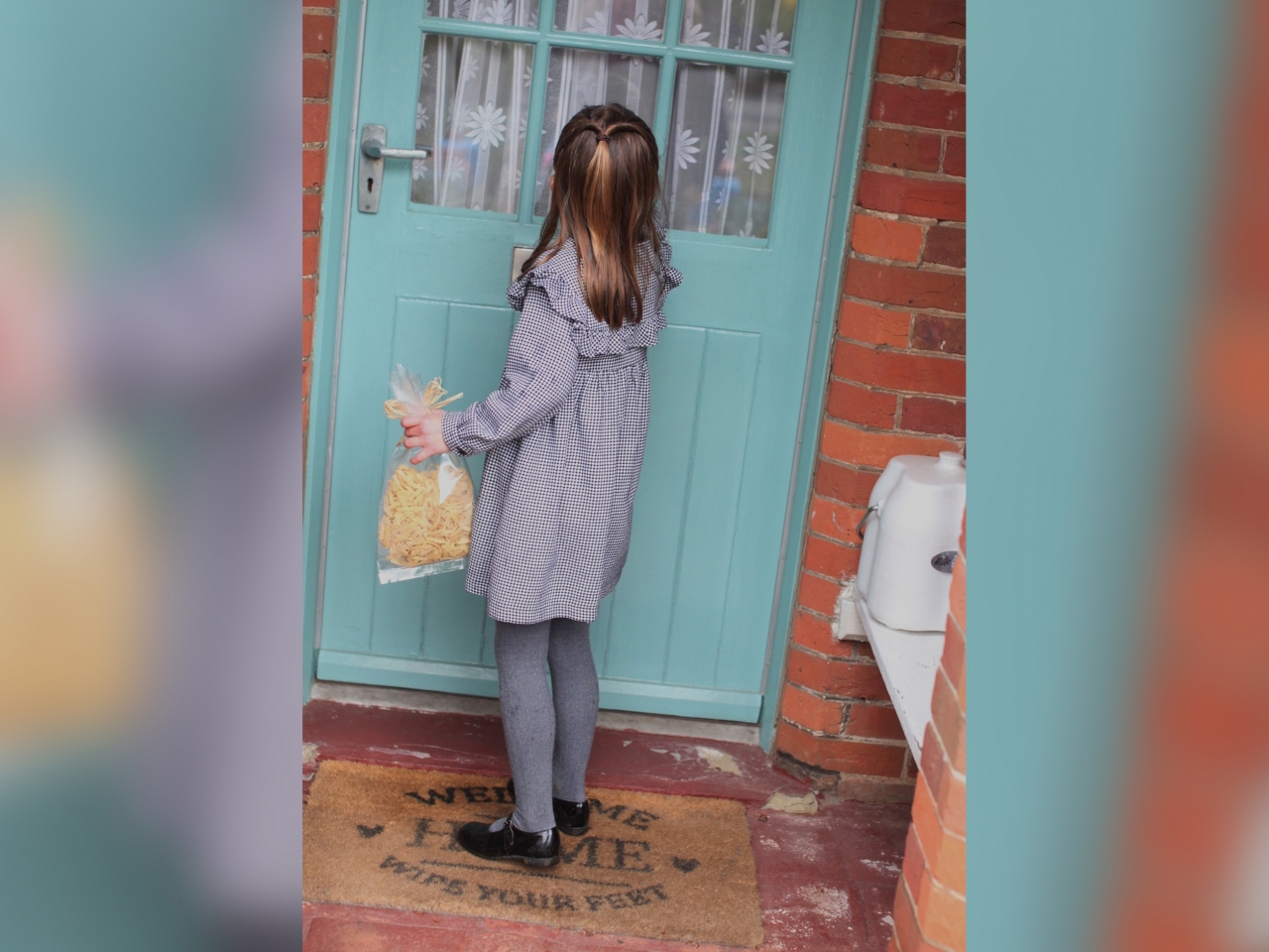 王室發布了4張相,在其中一張,夏洛特拿著一包意粉,在民眾家門前叩門;其中兩張就見到她拿起已袋好的盒裝食物;另一張就是特寫照。
