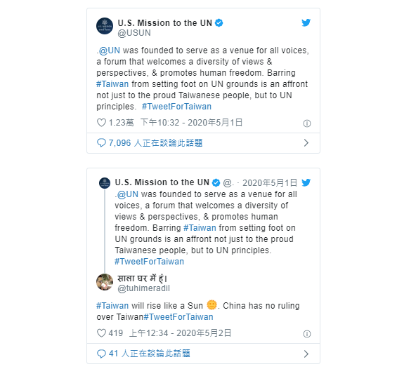 此外,美國駐聯合國常任代表團近來另轉推美國國務院國際組織事務局的一系列推文,彰顯台灣對抗2019冠狀病毒疾病的成就,讚揚台灣是因應疫情的世界榜樣。