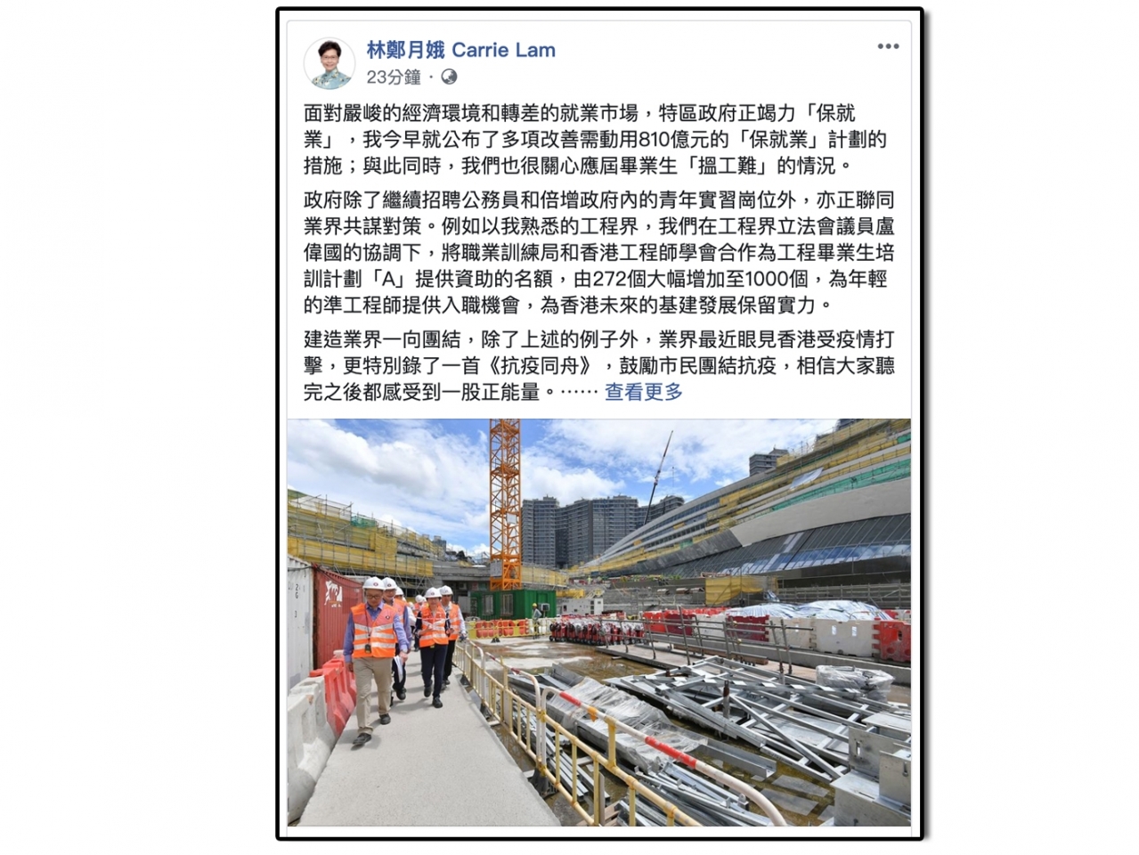 行政長官林鄭月娥在社交專頁表示,面對嚴峻的經濟環境和轉差的就業市場,特區政府正竭力「保就業」,今早公布多項改善810億元「保就業」計劃措施,同時亦很關心應屆畢業生「搵工難」的情況。