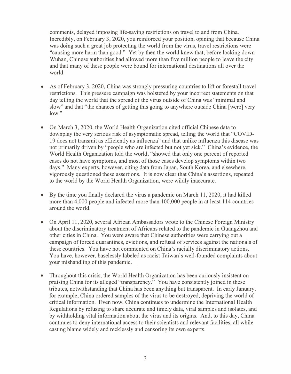 信函依时序列出世卫处理疫情的缺失,包括无视台湾政府提出人传人的警告、多次赞扬中国防疫工作、直到3月11日全球10万人感染才宣布病毒大流行等。
