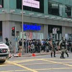 大批防暴警員在鵝頸橋施放多枚催淚彈後,在軒尼詩道戒備,突然被投擲物件。有警員要由同袍以盾牌協助離開,之後有警員向堅拿道西方向發射胡椒球彈。
