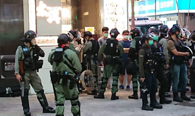 港澳香港 一批巿民在朗豪坊內外聚集 防暴警察截查部分人 由 中華時報總編室 - 2020年5月24日 一批巿民在旺角朗豪坊商場內外聚集,防暴警察於商場對出的砵蘭街,截查部分人士。 防暴警察於砵蘭街一間餐廳外,拉起封鎖線,截查部份巿民,部分警員持槍及盾牌戒備。附近馬路一度被幾個發泡膠箱阻塞,其後有工程車到場吊走。 而在商場內,幾個樓層都有巿民站在圍欄邊,部分人高叫口號。