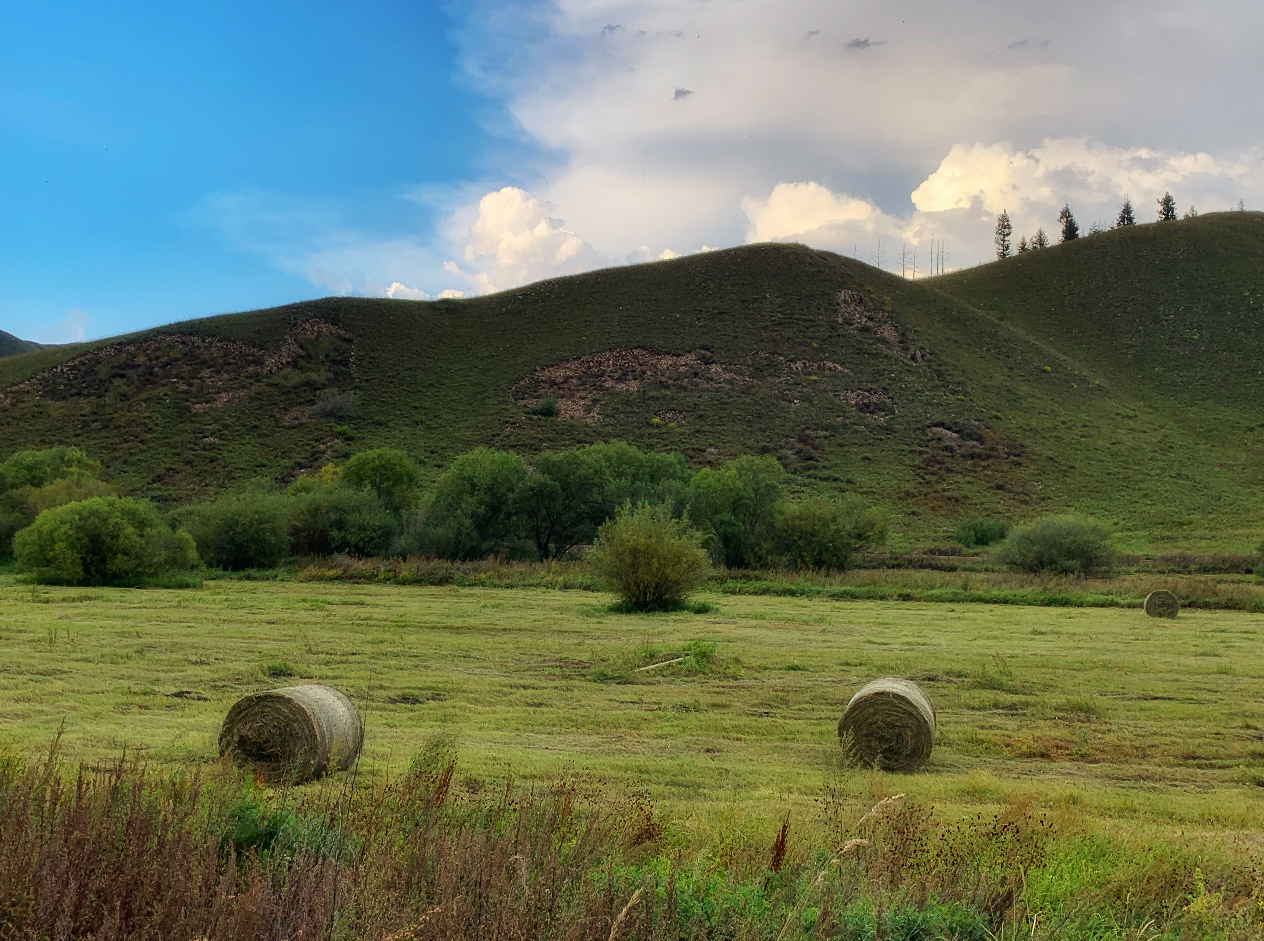 沿途景致秋意浓厚,草原上那一小堆一小堆的,开始不知道是啥,当地的画家陈国生告诉我,这是牧民打下来的干草,留着过冬用的。