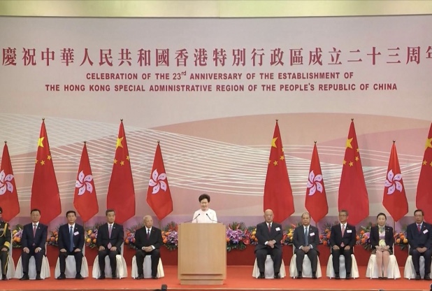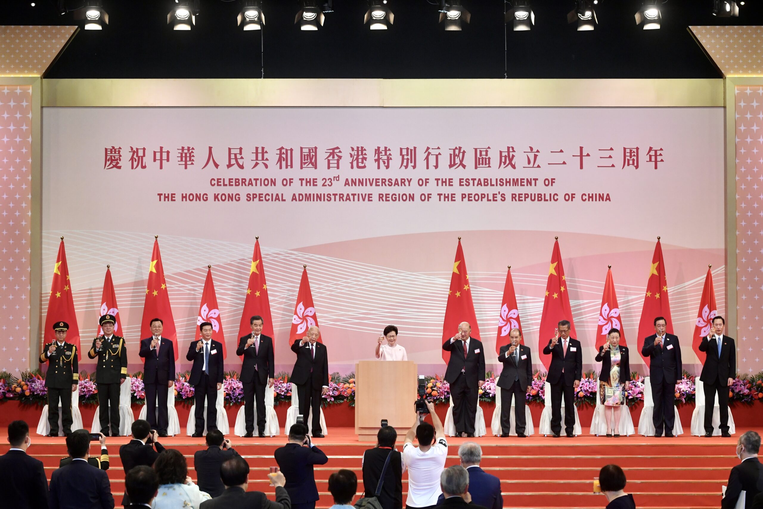 (中华时报香港讯)香港特區成立23周年慶祝酒會在會展舉行,行政長官林鄭月娥、前特首董建華、梁振英、曾蔭權,各司局長、行會成員、立法會主席和部分建制派議員、終審法院首席法官馬道立,以及中聯辦主任部駱惠寧、外交部駐港特派員公署特派員謝鋒,以及解放軍駐港部隊司令員陳道祥等出席。
