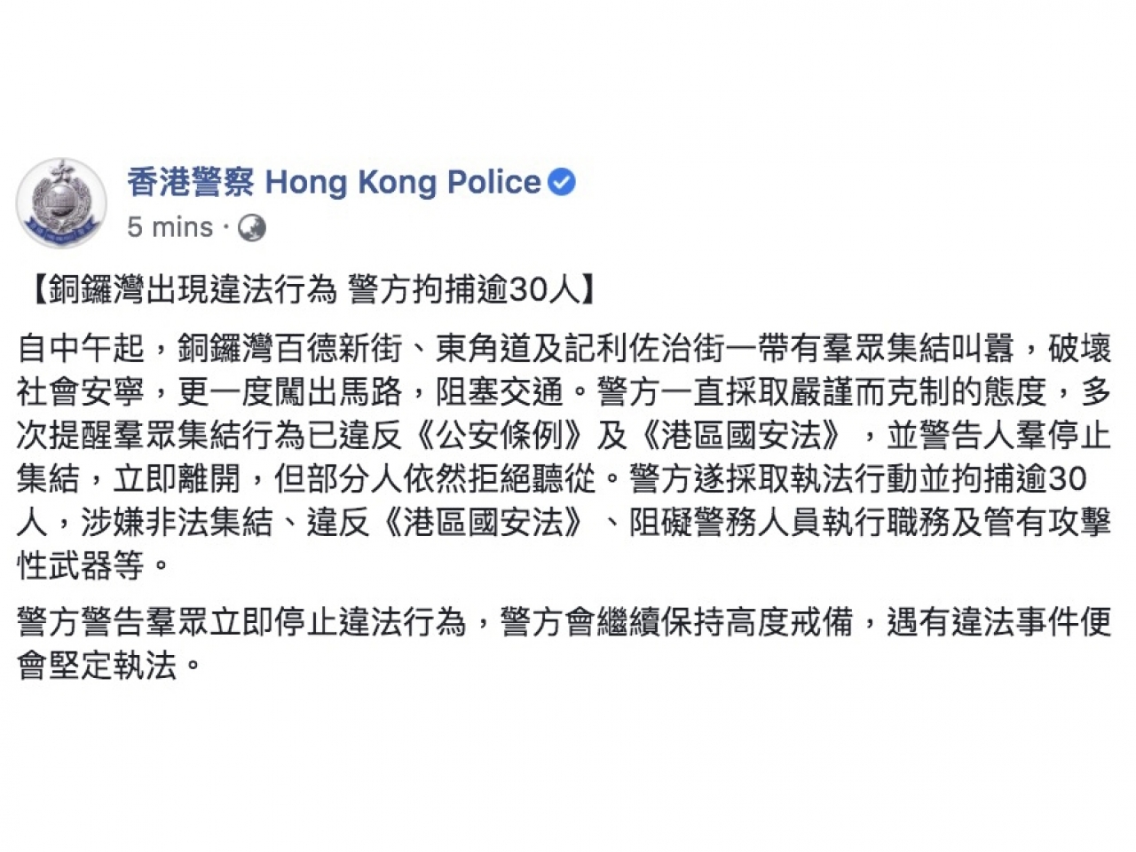 专题港澳港版國安法香港 警方出動水炮車驅散人群 拘逾30人涉非法集結等 由 中華時報總編室 - 编发 2020年7月1日 大批市民在銅鑼灣多個地點聚集。有人行出軒尼詩道的馬路,水炮車在下午2時許,在軒尼詩道近天樂里及鵝頸橋底位置,兩度發射水柱驅散人群。 警方表示,中午起,銅鑼灣百德新街、東角道及記利佐治街一帶有群眾集結叫囂,多次並警告後,有人走出馬路,影響交通秩序,已經出動人群管理特別用途車輛,協助驅散及執法行動。 警方至今已拘捕逾30人,涉嫌非法集結、違反《港區國安法》、阻礙警務人員執行職務及管有攻擊性武器等。