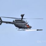 漢光演習「三軍聯合反登陸作戰」操演16日上午在台中甲南海灘舉行,圖為參加演習的OH-58戰搜直升機發射地獄火飛彈。中央社記者王飛華攝 109年7月16日
