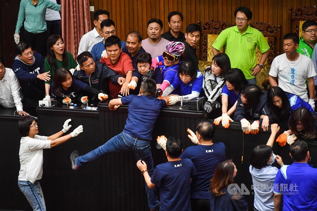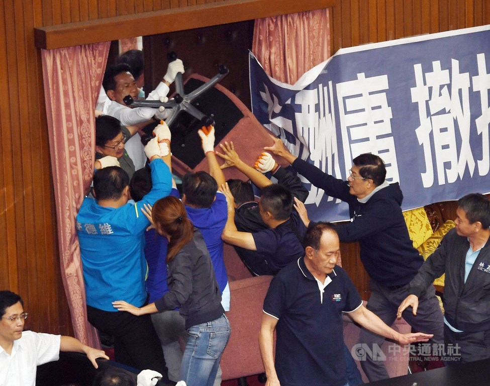 為求明天能順利行使同意權投票,民進黨團今天下午15時47分進場,與國民黨立委爆發嚴重推擠;部分國民黨立委遭民進黨立委抬走後,群起繞到側門,再從議場後門猛撞,讓民進黨立委反而遭到包圍。