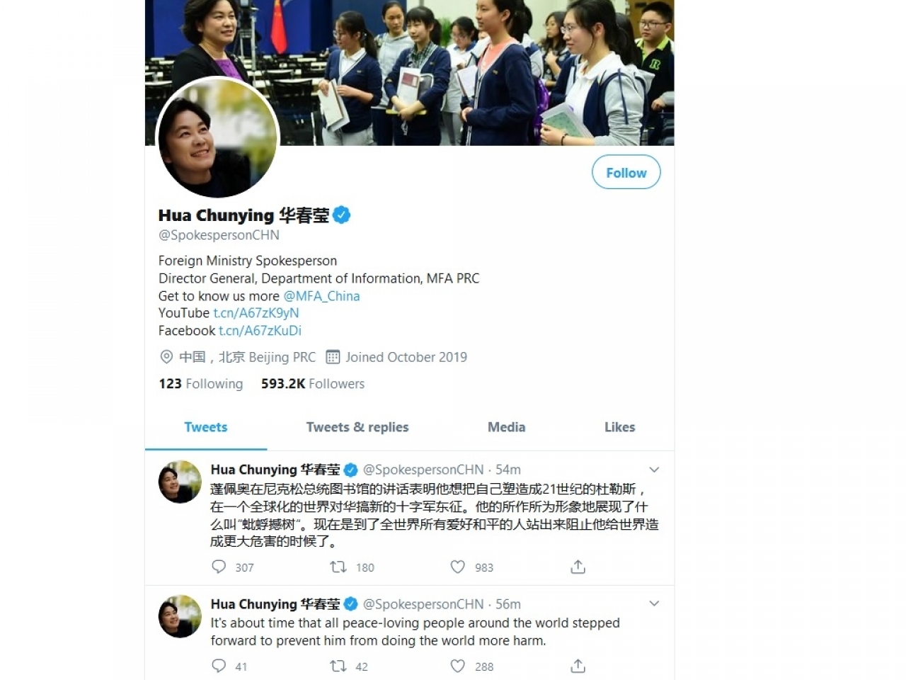 兩岸国际大陆 華春瑩批評蓬佩奧的講話是對華搞新的十字軍東征 由 中華時報總編室 - 编发 2020年7月24日 華春瑩在社交媒體,分別以中英文回應蓬佩奧的講話。(華春瑩twitter) 美國國務卿蓬佩奧發表演講,批評中共威脅美國經濟、以及全球未來的自由民主,又指中共盜取知識產權、隱瞞疫情,呼籲盟友施壓,要求中共改變行為,又形容中國國家主席習近平,是一名「已經誠信破產的威權主義思想真正信奉者」。在北京,外交部發言人華春瑩在社交媒體,分別以中英文回應,批評蓬佩奧的講話表明他想將自己塑造成21世紀的杜勒斯,在一個全球化的世界對華搞新的十字軍東征。華春瑩說,蓬佩奧的所作所為,形象地展現什麼叫「蚍蜉撼樹」,全世界所有愛好和平的人,是時候站出來,阻止他為世界造成更大危害。