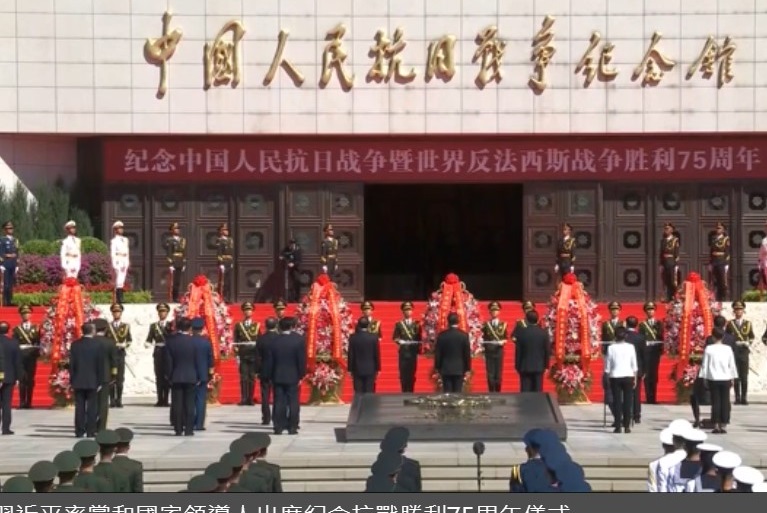 兩岸大陆 習近平率黨和國家領導人出席紀念抗戰勝利75周年儀式 由 中華時報總編室 - 2020年9月3日 今日是中國人民抗日戰爭勝利紀念日。中共總書記、國家主席習近平率領6名政治局常委,以及久未露面的國家副主席王岐山等黨和國家領導人,向抗戰烈士敬獻花籃,紀念二戰及抗日戰爭勝利75周年。 儀式早上10時在中國人民抗日戰爭紀念館舉行,以國家名義向抗戰烈士致敬,習近平等人身穿黑色西裝進場,向抗戰生還者致敬。 獻花儀式由北京市委書記蔡奇主持,現場先奏唱國歌,眾人再向犧牲的烈士默哀,並舉行獻花籃儀式,抗戰烈士的親人和家屬、解放軍海陸空三軍代表、北京各界代表亦有出席。