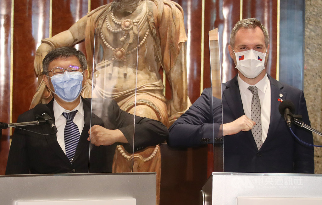 台北市長柯文哲(左)與捷克首都布拉格市長賀瑞普(Zdeněk Hřib)(右)4日上午在台北會面,結束後舉辦記者會接受媒體訪問,兩人以手肘互碰致意。