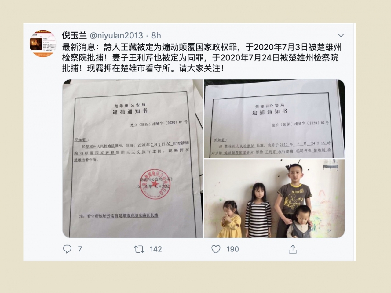 兩岸大陆 內地詩人王藏與妻子遭內地以涉嫌煽動顛覆國家政權拘捕 由 中華時報總編室 - 编发 2020年9月6日 倪玉蘭表示,王藏至今被捕100日,至今並無其消息。(倪玉蘭社交平台) 原名王玉文的內地詩人王藏與其妻子王麗,涉嫌煽動顛覆國家政權罪逮捕,兩人目前都被羈押在雲南楚雄市的看守所。 根據前律師倪玉蘭在社交平台表示,王藏至今被捕100日,至今並無其消息。王藏的母親、妻子王麗、弟弟和4名子女,之後亦失去聯絡。 王藏據報曾因為聲援佔領運動,被當局以涉嫌尋釁滋事罪關押9個月。他在去年亦曾被帶走,之後獲釋,他事後向傳媒說,被傳召是因為在個人社交平台Twitter轉載歌手何韻詩的一段講話短片,以及由於反修例運動和89事件。