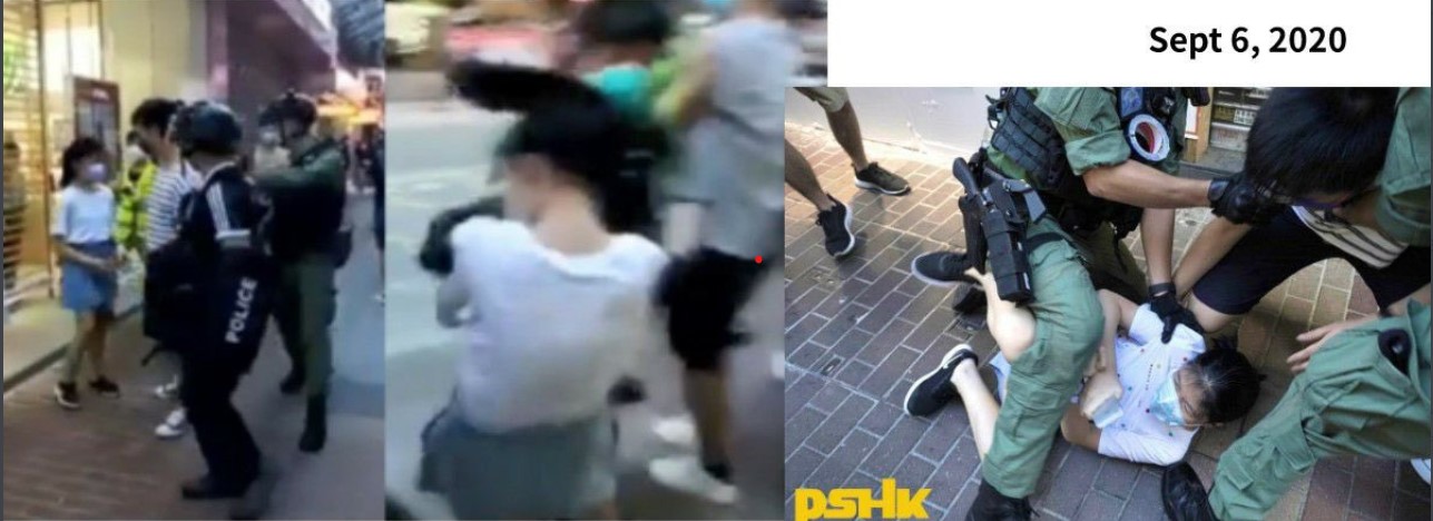 在一些地方,示威者和警察之间的对峙演变为暴力冲突,示威者向警察投掷雨伞和水瓶,警察则以胡椒球回应,并将数名示威者制服在地,从12岁少女被几名警察扑倒在地的视频。有报道称她不过是和哥哥一起去买颜料。