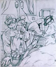 《疫情》(1-2) (紙本重彩 25x20cm;《疫情》(3-8) (紙本重彩 12x10cm;《疫情》(9-10) (紙本重彩 13x18cm