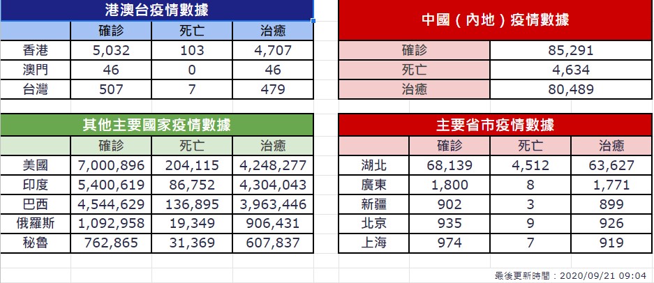 美國約翰霍普金斯大學(Johns Hopkins University)疫情地圖顯示,截至香港21日上午9時,全球至少95萬8493人死於新冠肺炎,至少3088萬1522人染疫。