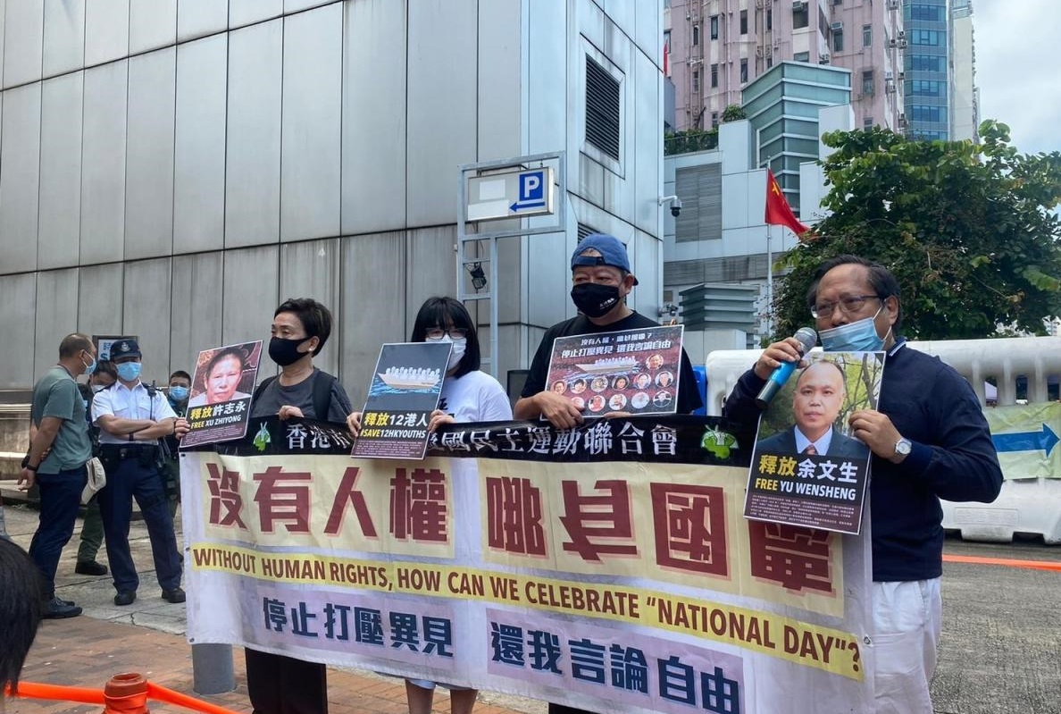 警方在中聯辦外設置水馬,大批警員在場戒備。李卓人和何俊仁等人將印上「沒有人權,哪有國慶」的橫額貼在水馬上。期間警方多次警告在場人士違反限聚令,又警告不得超越4人的聚集,否則會作出票控,現場所見,警方已票控李卓人,李卓人即場撕爛告票。