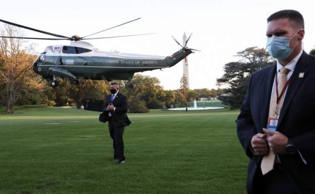 周五下午,特朗普穿着西装、戴着口罩自主走出白宫,穿过白宫草坪走到他的“海军陆战队一号”直升机前,搭乘直升机短途飞往华盛顿特区郊区的沃尔特·里德国家军事医学中心。