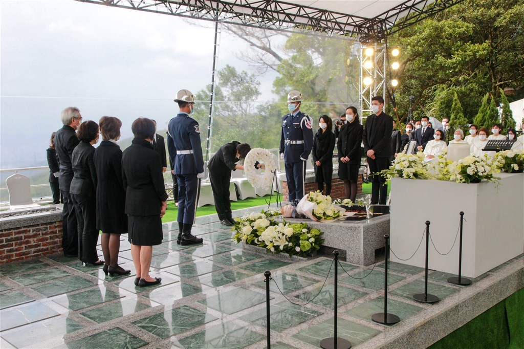送行人員安放十字架、遺像、國旗盒、褒揚令及骨罐;李登輝家屬在靈前獻花行三鞠躬禮,再由蔡總統禮敬獻花行三鞠躬禮,隨後由主禮官副總統賴清德率陪禮人員行三鞠躬禮。