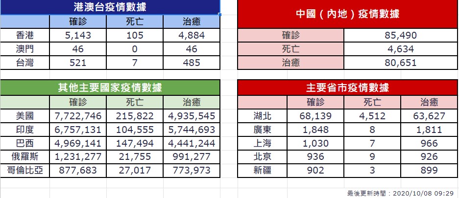 根據美國約翰霍普金斯大學(Johns Hopkins University)追蹤數據資料,截至台灣8日上午7時,全球至少105萬2736人死於新冠肺炎,超過3599萬8606例確診。