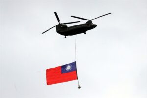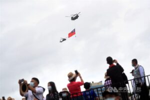 此外,最受矚目的空中展演項目,除陸航CH-47SD運輸直升機吊掛國旗,搭配UH-60M黑鷹直升機編隊,也有雷虎小組為天空畫上藍白紅彩煙,更加入了近年完成升級的F-16V戰機,首次在府前上空編隊衝場。