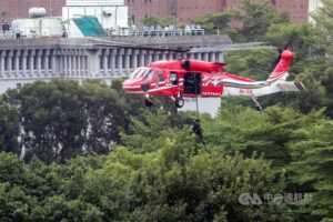 國慶典禮今天舉行,序幕暖場階段,由三軍樂儀隊、憲兵快反連、維安特勤隊及空勤總隊黑鷹演出及演練,俗稱「紅鷹」的空勤UH-60M黑鷹直升機,首次以低高度飛進總統府限航區。