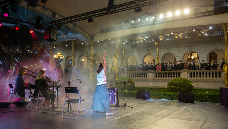 之後,總統與現場賓客一同欣賞「高雄鼓道場」手碟鼓世界音樂,以及「We R. 特技跆拳表演團」結合街舞與跆拳道之特技表演,現場氣氛熱鬧歡愉,主賓互動熱絡。