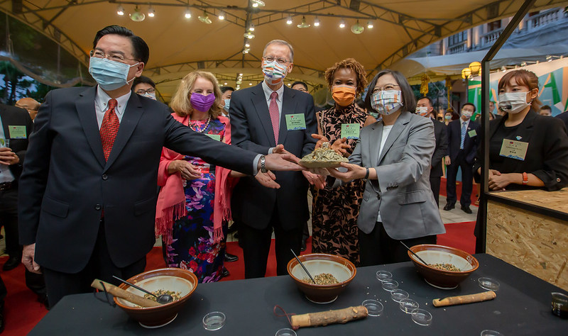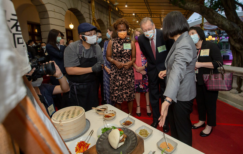 會場設有盛橋刈包、菓實日及N-Ice Taipei等知名美食攤位,總統也與使節團團長暨聖克里斯多福及尼維斯駐臺大使哈菁絲(Jasmine Elise Huggins)、美國在台協會台北辦事處處長酈英傑(William Brent Christensen)伉儷等一同參觀攤位,聽取紅蔥滷肉飯刈包、「紅龜」等特色美食介紹,亦親自製作客家擂茶雪花冰。