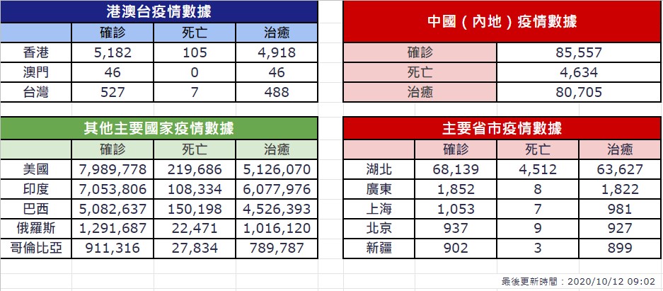 (中華時報/華聞社10月12日香港電)2019冠狀病毒疾病(COVID-19,)疫情不平靜,印度疫情直逼美國,確診破700萬例;俄羅斯新增1萬3634人確診,創下單日新高;韓國、印尼疫情趨緩,初步鬆綁防疫措施。