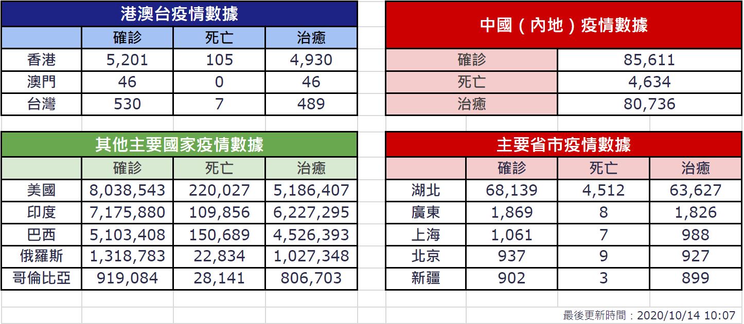 約翰霍普金斯大學(Johns Hopkins University)追蹤地圖顯示,截至香港14日上午7時,全球至少108萬3875人死於新冠肺炎,超過3800萬6121例確診。