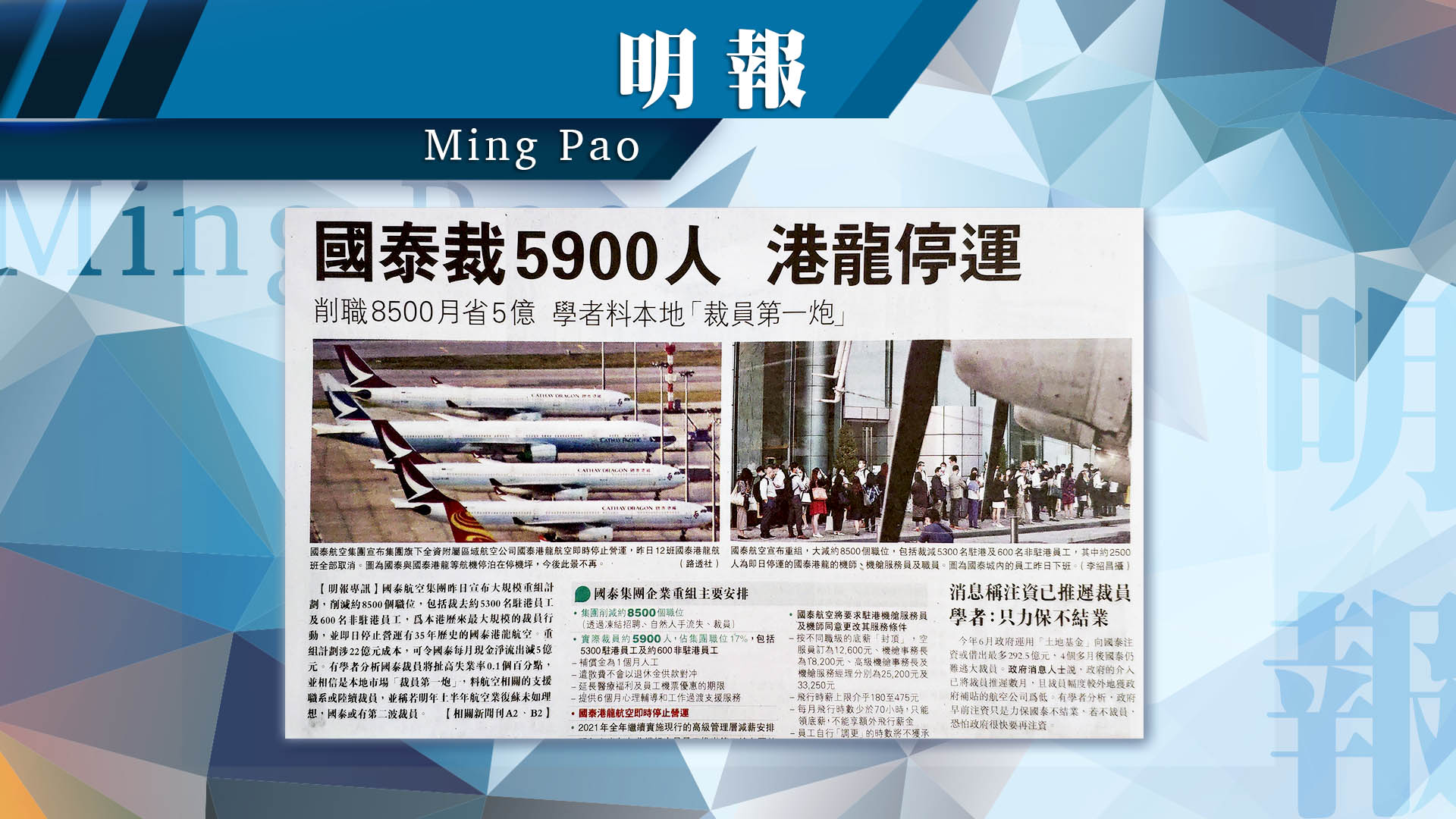 《明報》﹣ 國泰裁5900人 港龍停運 削職8500月省5億 學者料本地「裁員第一炮」