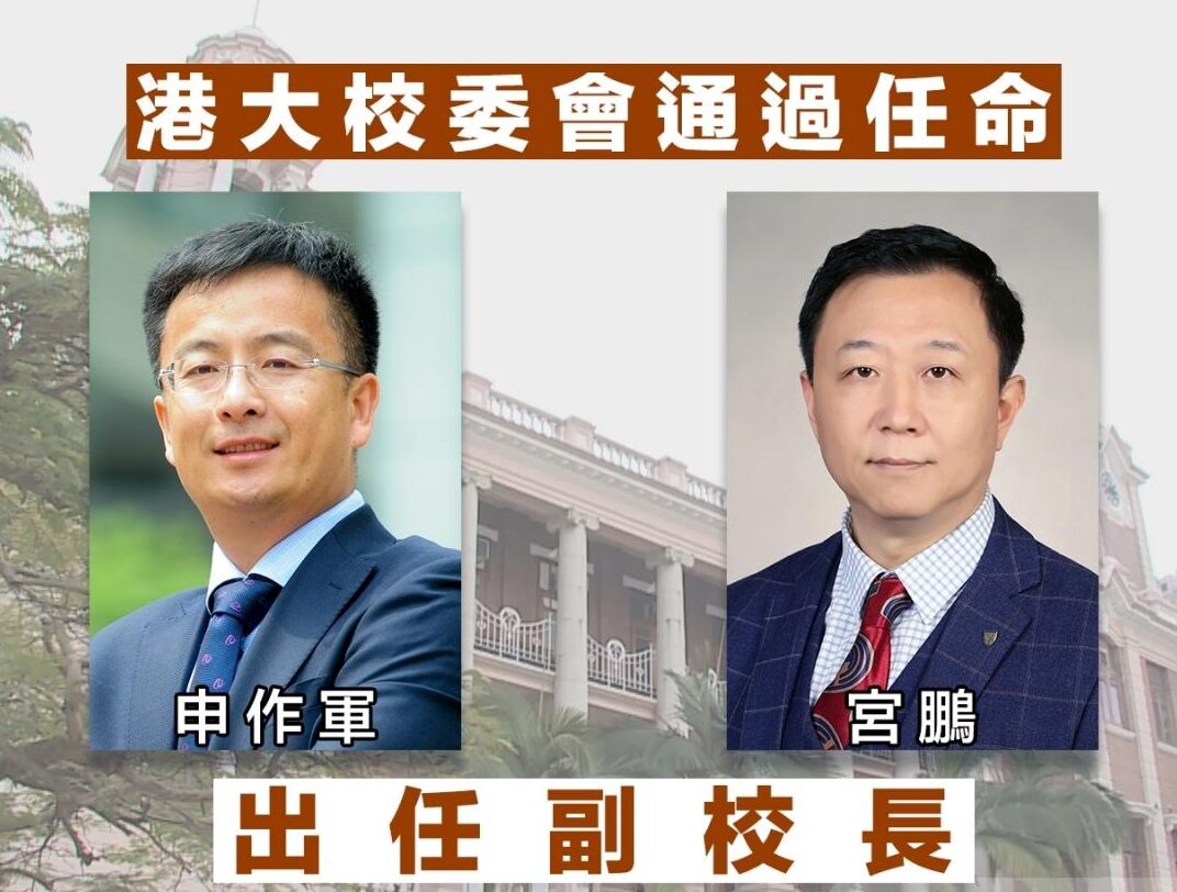 (中華時報/華聞社10月27日香港電)香港大學表示,港大校委會議決委任兩名清華大學學者申作軍及宮鵬為副校長,分別負責研究及學術發展,亦委任法律學院教授傅華伶為法律學院院長,任期皆為5年。