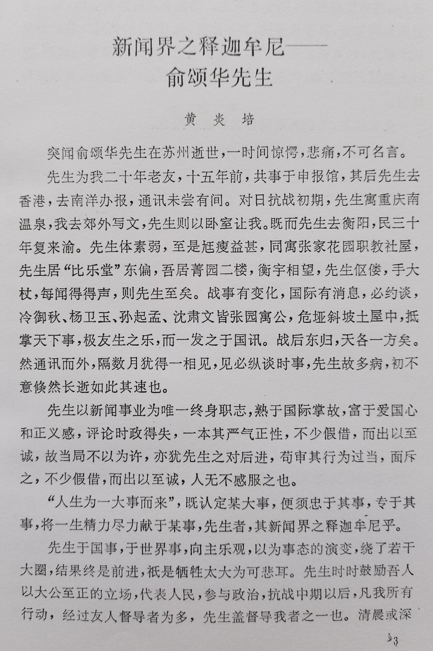 2019年初,我拜访俞颂华的学生93岁的方汉奇(中国人民大学新闻学院教授)和94岁的张英霖(苏州博物馆原馆长),他们对俞颂华的深情回忆,使我深为感动。