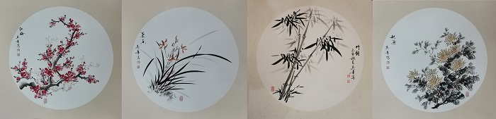 作品是畫家的精神訴求與流露,也是畫家人生態度的表達和人生追求的體現。「四君子」中梅紅豔,蘭秀雅,竹高潔,菊清美;水痕墨氣,躍然紙上。有人形容其作畫神態,亦見於法度與性情之間,落筆如雲煙,胸中之鬱勃,筆底造化,都在瞬息之間。如此種種,足以見得其文化修養、精神境界與智慧靈性。