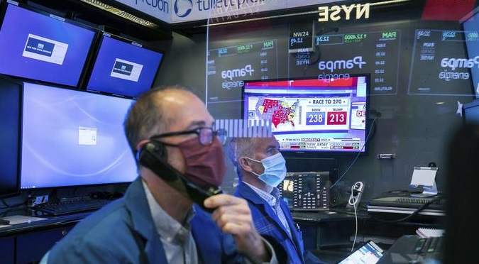 (中华时报/华闻社驻北美记者曾国龙 11月5日发自华盛顿)周三,美国总统选举日的第二天,道琼斯工业指数一度上扬2.9%,堪称120年里最强劲的选后表现。不过当日收盘时,道琼斯只比一日前增长了1.3%,停落在27847点;S&P 500增2.2%;纳斯达克上窜了4个百分点。