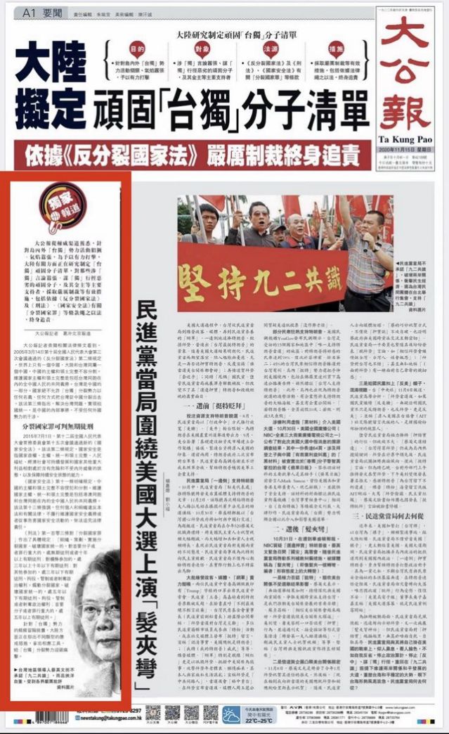 综合《大公报》《自由时报》、观察者网等两岸三地媒体报道,这项清单将针对“涉‘独’言论嚣张、谋‘独’行径恶劣的顽固分子”,及其金主等主要支持者。台湾陆委会昨天对此回应,指责北京“煽动两岸对立情绪”,警告只会“适得其反”。